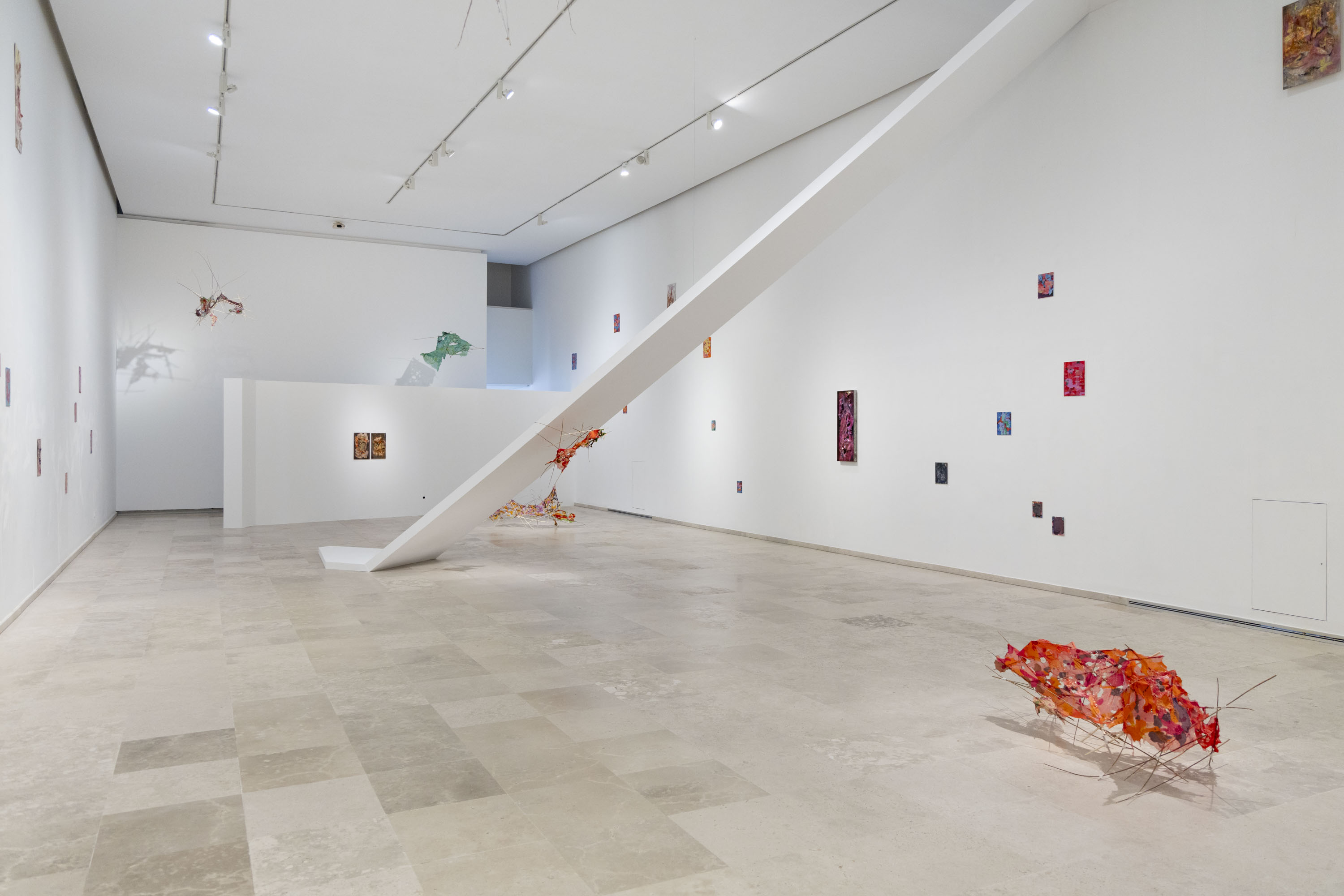 The architecture of the room has been altered so that it can escape from its own logic. The works of art are scattered throughout, as if they had come to a space that is falling apart and were responsible for holding it together: each one is just where it should be, and if only one were to leave, everything else would collapse. Some emerge from the surface, like organic bas-reliefs, crafted from the material used to make dolls. The body recognises this material before identifying it: soft, a little cool, pinkish, with that texture that was perhaps our first contact with something that mimicked a body, without actually being one. Like skins that have found the wall to rest upon. There are also smaller, more vulnerable pieces. Paintings that form a kind of record of intimacy: moments captured with the same caution with which you preserve the residue of something you no longer quite remember. The colour in them is not chosen all at once: it comes, settles, and stays. The layers build upon one another with the same logic by which certain memories accumulate – not in order, but through persistence, because something keeps coming back until it finds its place. There is no neutral background: each shade is already the sum of what came before, a sedimentation that seeks not to conceal, but to add. They work like a polyphony: each has its own voice and could exist on its own, but together they create a dialogue that requires no agreement, only proximity. Small and scattered, each is a moment in itself – together, they generate an atmosphere that sustains everything else.