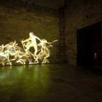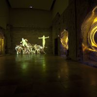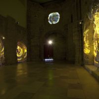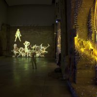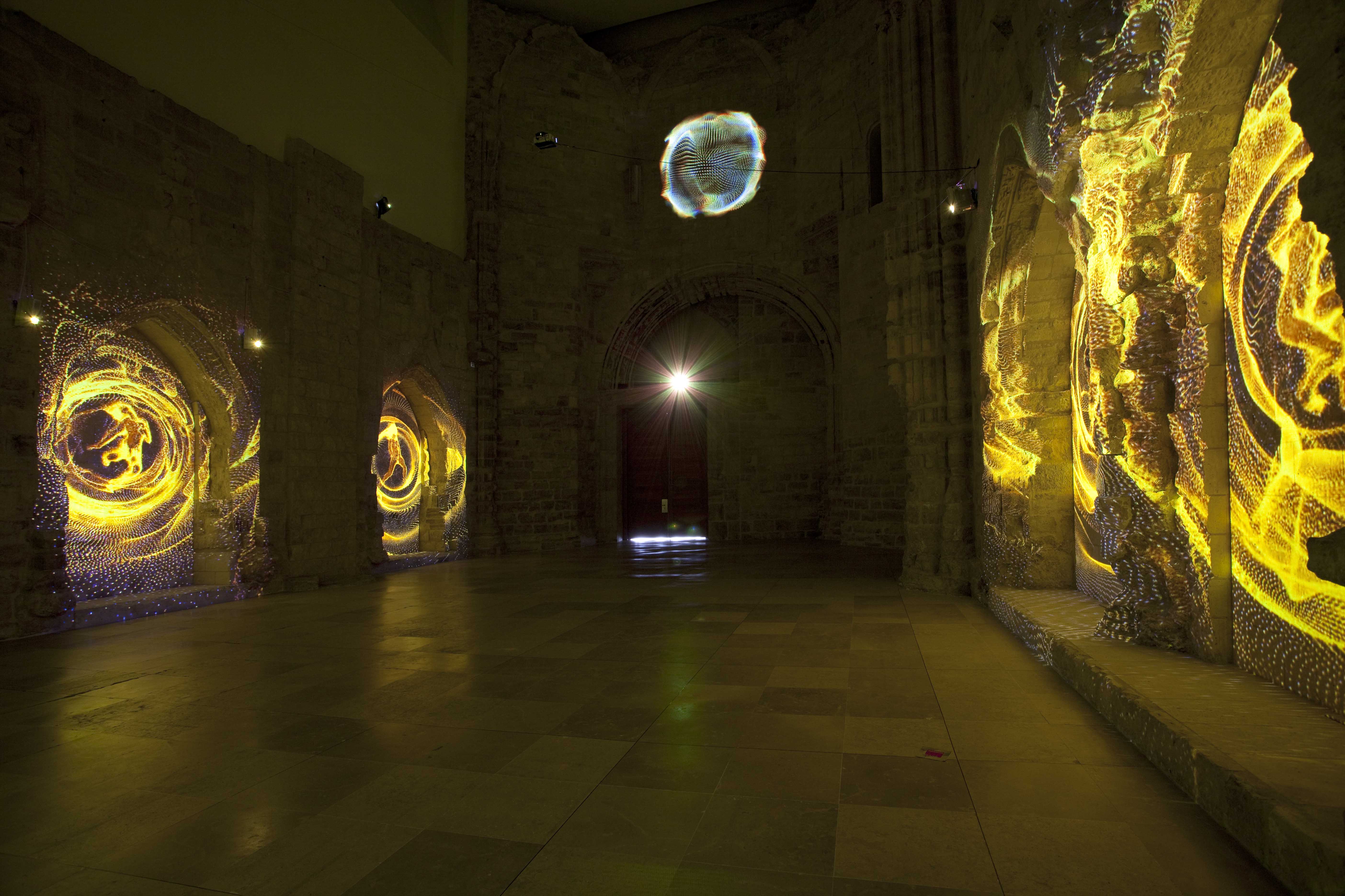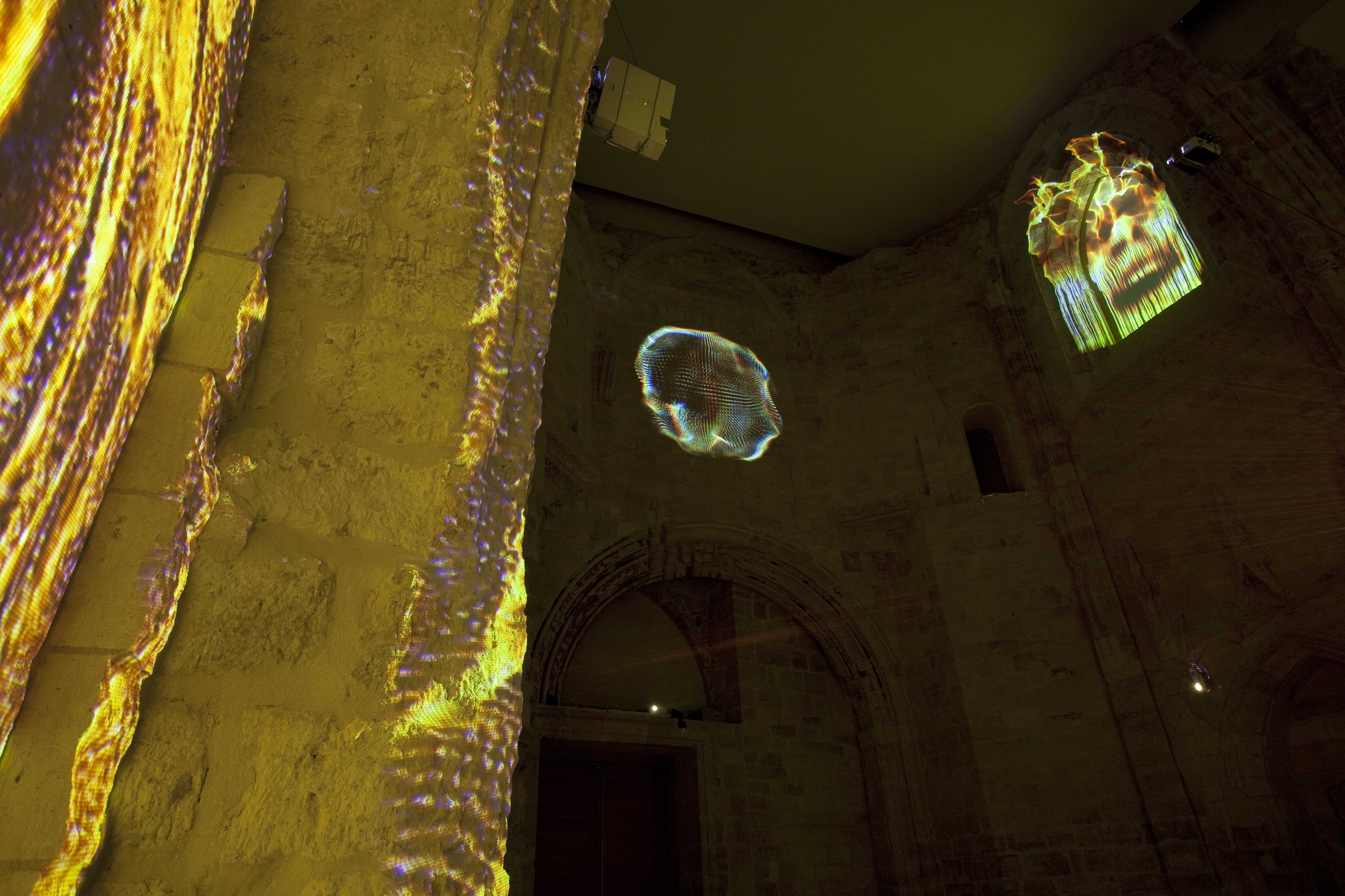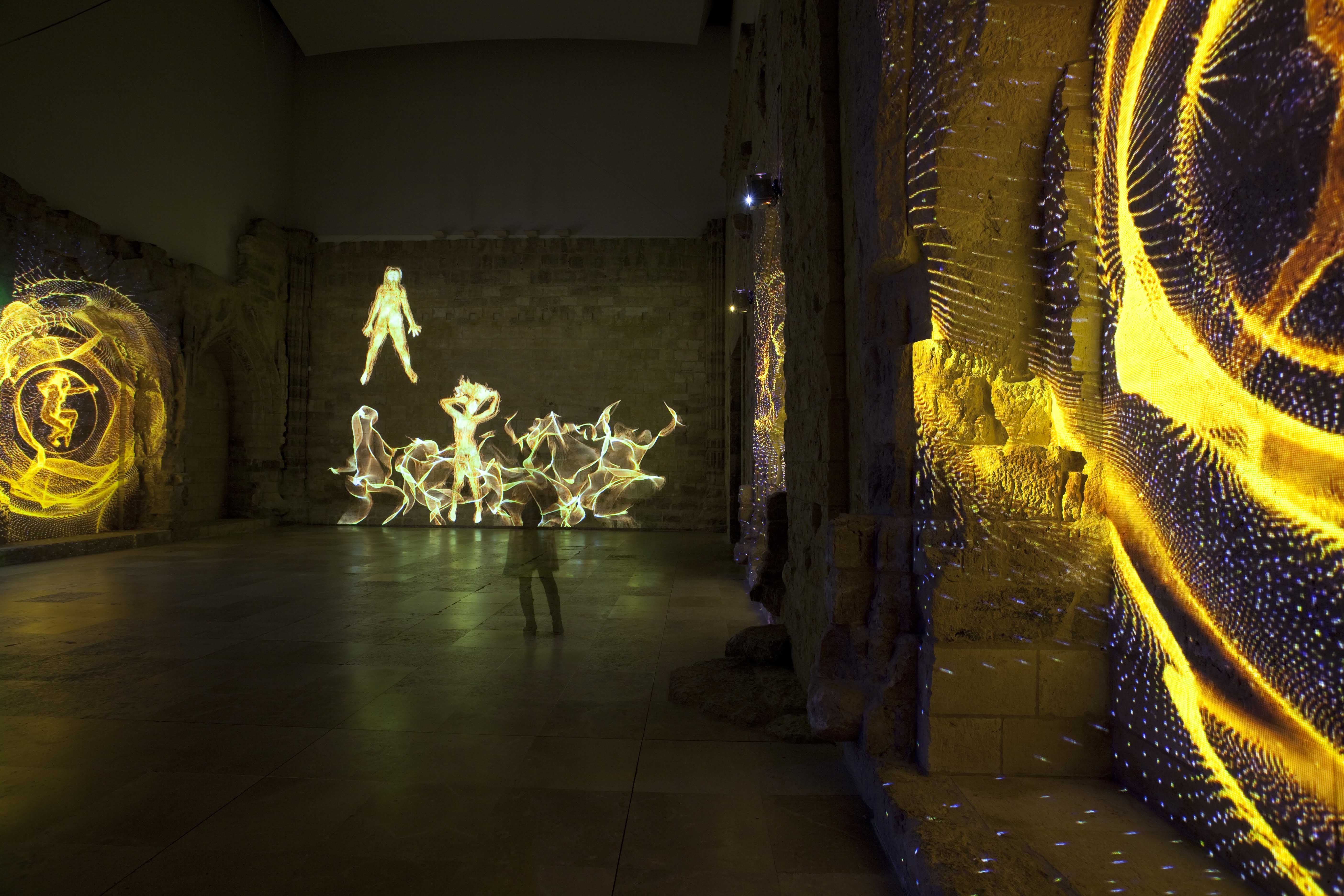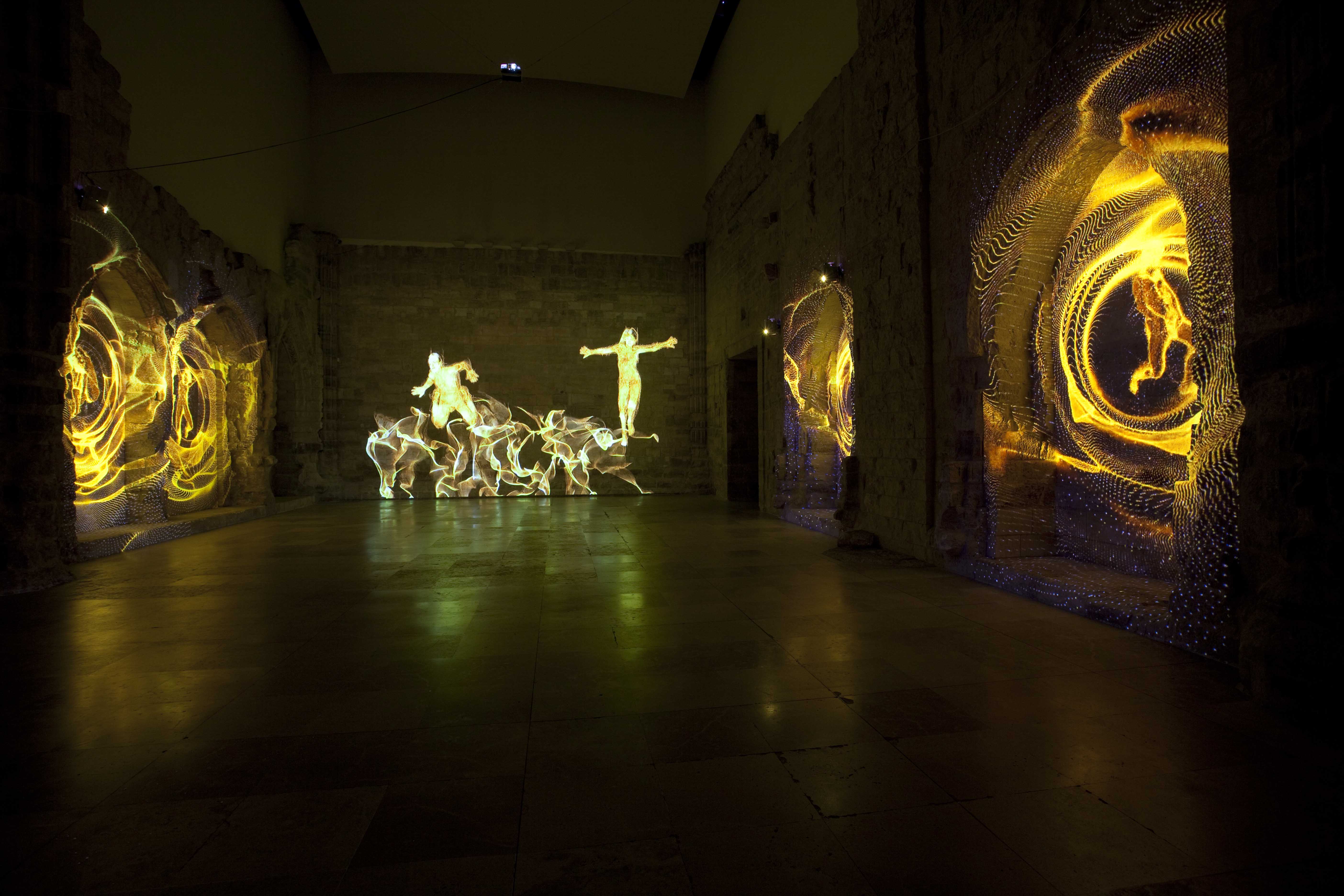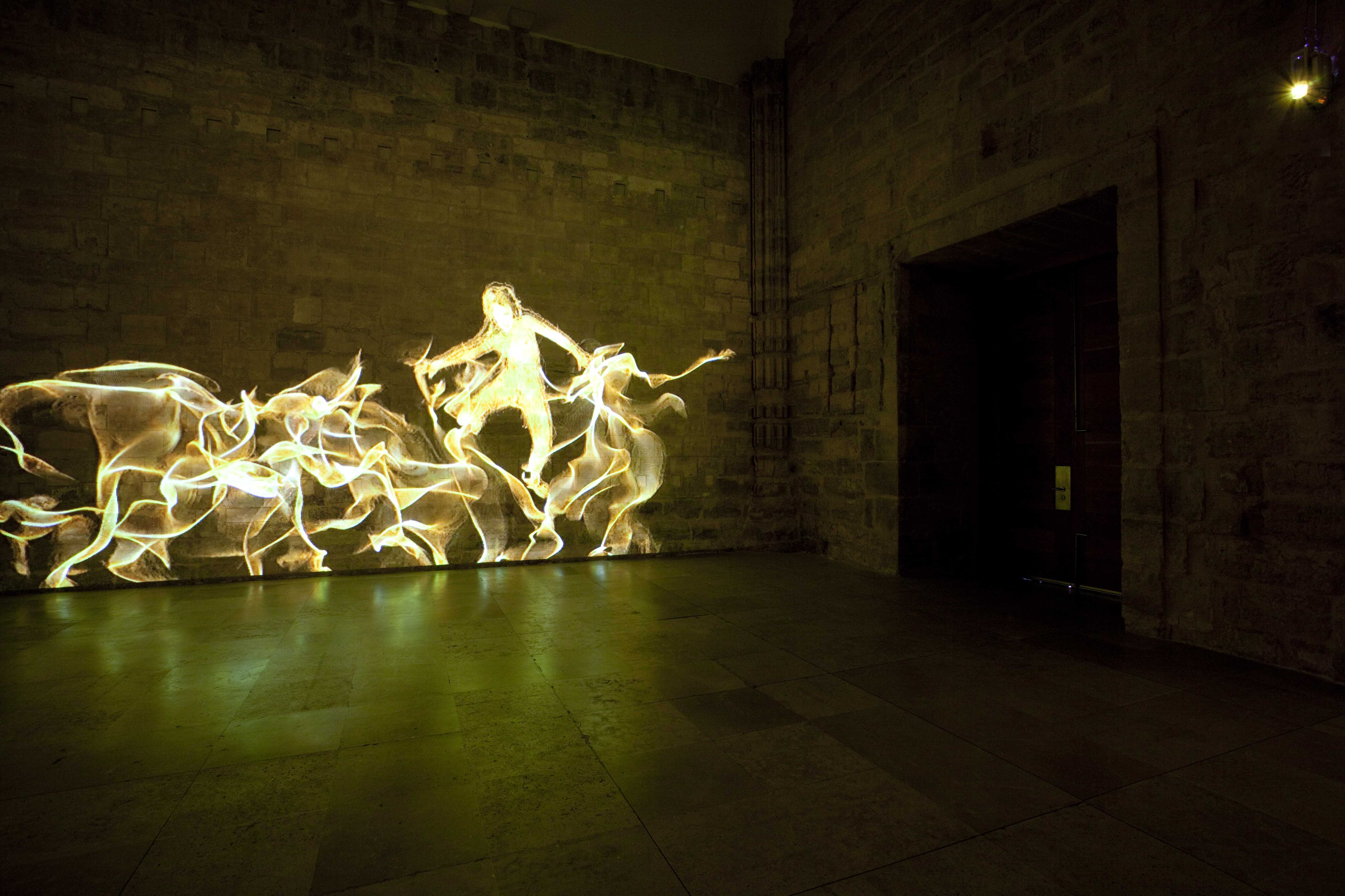 Para llamarnos la atención sobre estas reflexiones, cercanas a las del filósofo existencialista francés, Marina Núñez recurre en esta ocasión a una videoinstalación múltiple. Siete video-proyecciones evolucionan sobre las paredes de la Capilla del Patio Herreriano arrojando sobre sus sillares siluetas incandescentes de personas que se arrastran o son arrastradas por los muros. Las figuras, remiten iconográficamente a las poseídas por espíritus que las violentan, a las histéricas con sus retorcimientos y convulsiones, a los monstruos en los que las metamorfosis se suceden. Forman por tanto parte reconocible del universo de Marina. Como en el mismo entorno, una ruina reconstruida, se suceden procesos de caída y regeneración, en un movimiento fluido pero convulso, doloroso pero extático. Una vez más la capilla provoca al espectador invitándole a la reflexión desde los terrenos del arte.